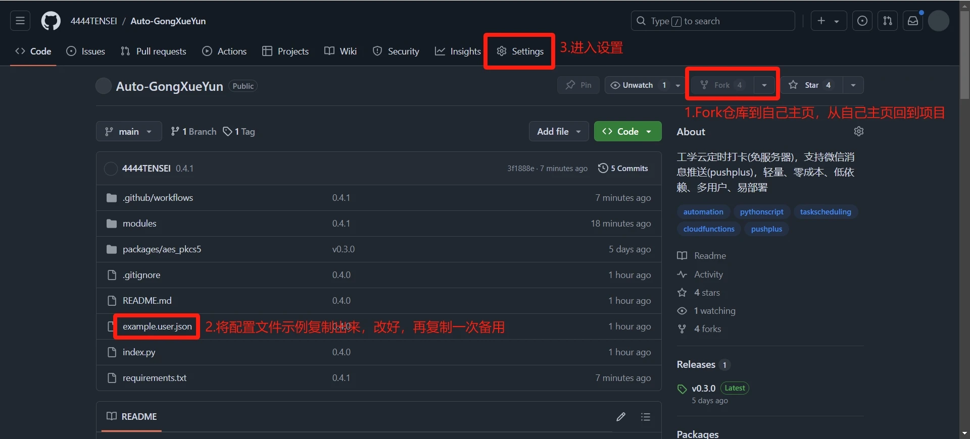 可以不看文字直接看图片,几步就走完了,另外说一下如果频繁利用工作流的话可能会被GitHub判定为滥用,但本项目的频率无碍,且方便好用。