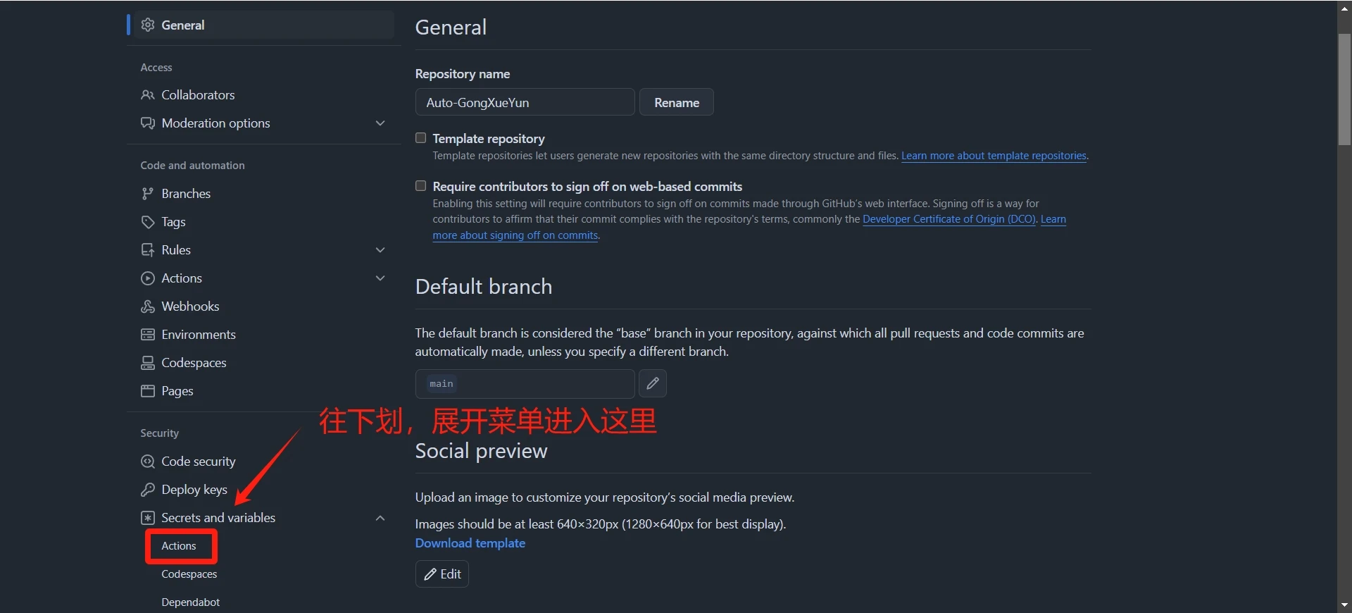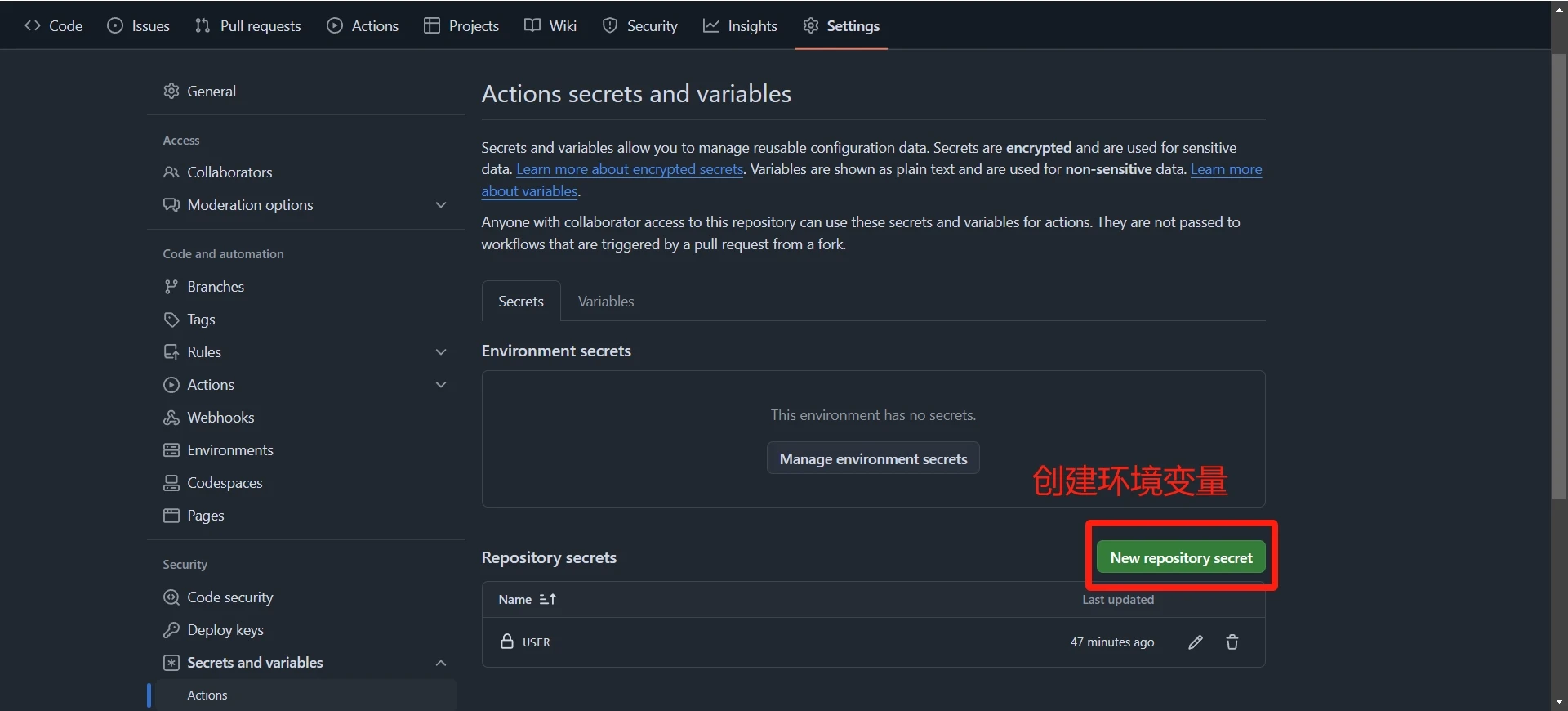 - 依次进入克隆后的仓库页面上方的:Settings→Actions secrets and variables→Actions