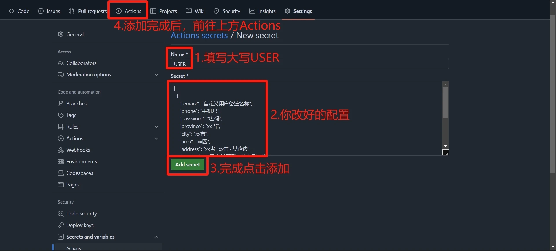 - 点击New repository secret,Name输入框填写USER,Secret输入框里粘贴刚刚复制的json配置,如果要多用户,则复制一次数据体自己改改,然后点击下方绿色Add secret按钮保存