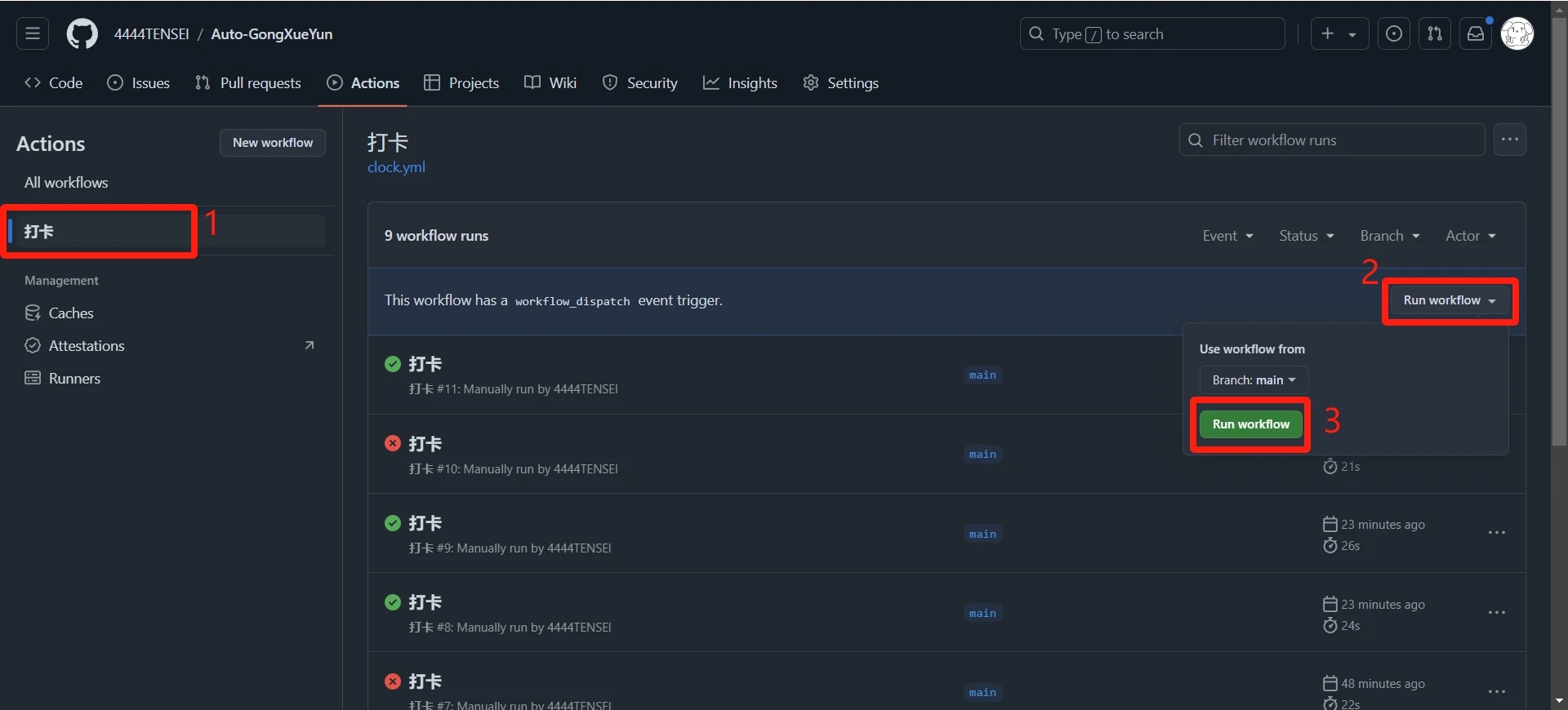 - 回到仓库左上角的Actions,点击左侧的打卡,点击右侧的Run workflow,再次点击绿色的Run workflow按钮即可开始定时任务