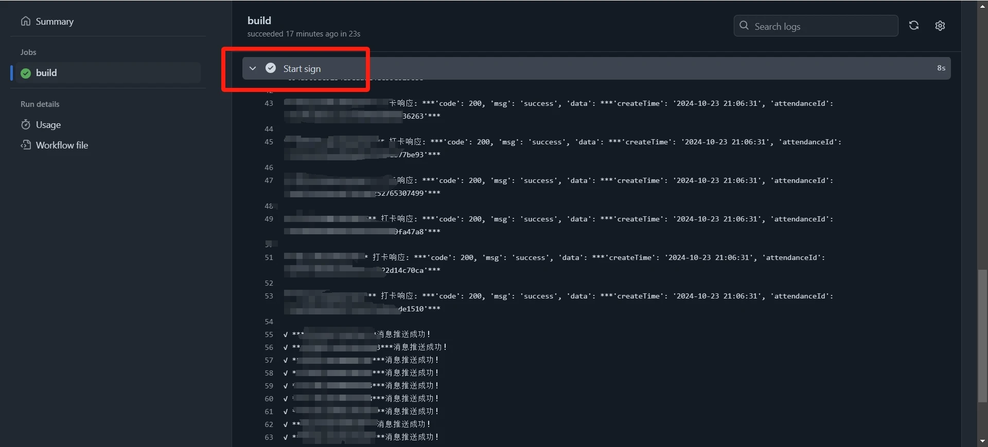 - 到这里就结束了,手机上应该能收到通知,配置了微信推送且没收到通知的话,看一下工作流日志,下面是运行成功的日志