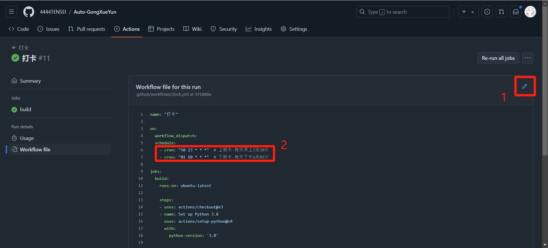 - 默认在工作流文件设置了两个打卡时间,注意:这里不是北京时间,有8个小时的偏移自行参考计算并且保持字数规范。如果要修改,自行百度cron表达式,然后去修改工作流文件👇